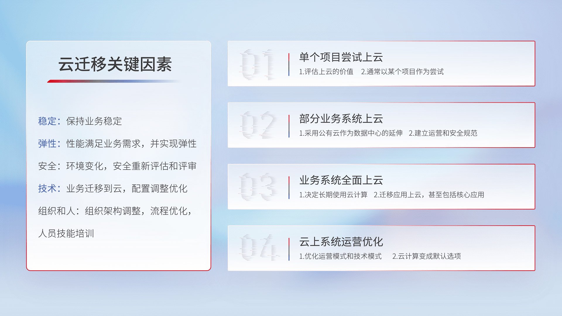 结合实际业务,,从规划设计、、云平台选型、、、、云原生改造、、、数据迁移、、集成交付,,,,迁移全过程为客户识别最佳上云路径,,做好风险识别管理,,设计网络架构、、、、身份权限、、、安全审计合规、、、、操作审计、、、日志审计、、、、监控告警策略、、、、多站点容灾设计等,,,,对云上基础设施进行整体规划,,,,提升IT治理水平,,,,以满足弹性、、、高可用、、高性能的需求。。