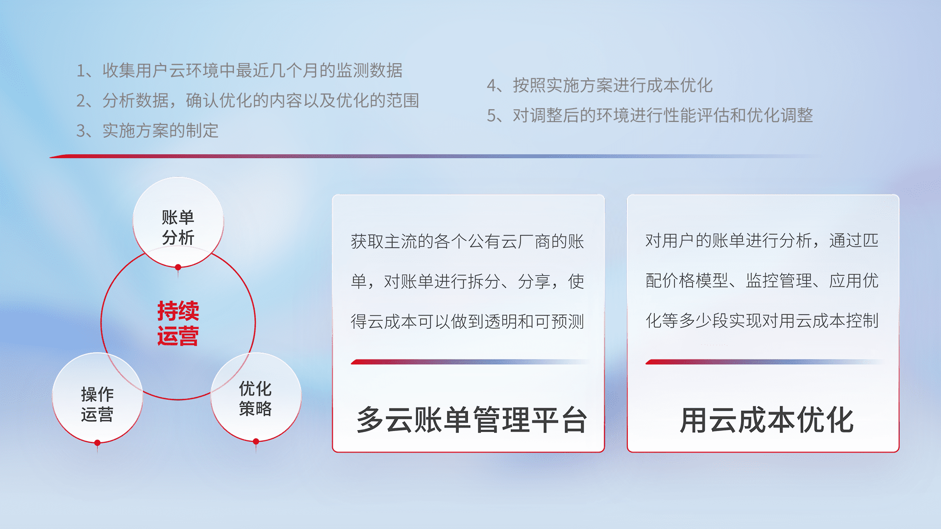通过多云纳管,,,以统一的资源数据模型把客户的云资源进行抽象和封装,,,进而实现对多云资源的统一操作,,保障云资源管理的可靠性、、、、稳定性与可用性。。量身定制化运维内容,,,配置、、、、开发运维、、、、补丁管理、、、备份、、监控、、、认证和访问管理、、、、审计和日常巡检等,,保障在用云过程中的可靠度,,稳定度以及高可用率。。