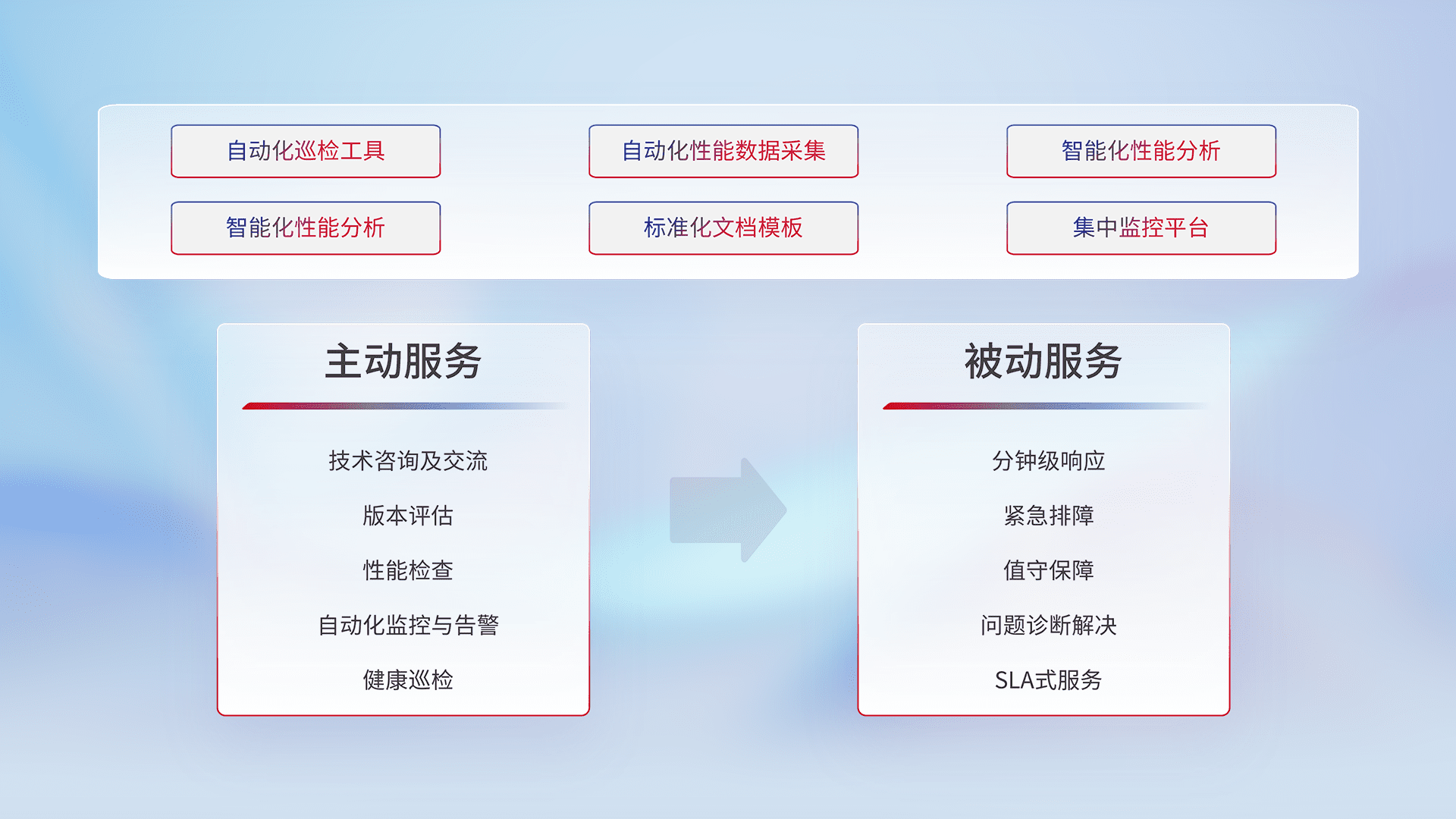 智能化工具和标准化文档,,,,保障服务质量,,,提供主动服务(包含技术咨询、、版本评估、、、性能检查、、、、自动化监控与告警、、、、健康巡检)和被动服务包含(分钟级响应、、、紧急排障、、、值守保障、、问题诊断解决、、、SLA服务)。。