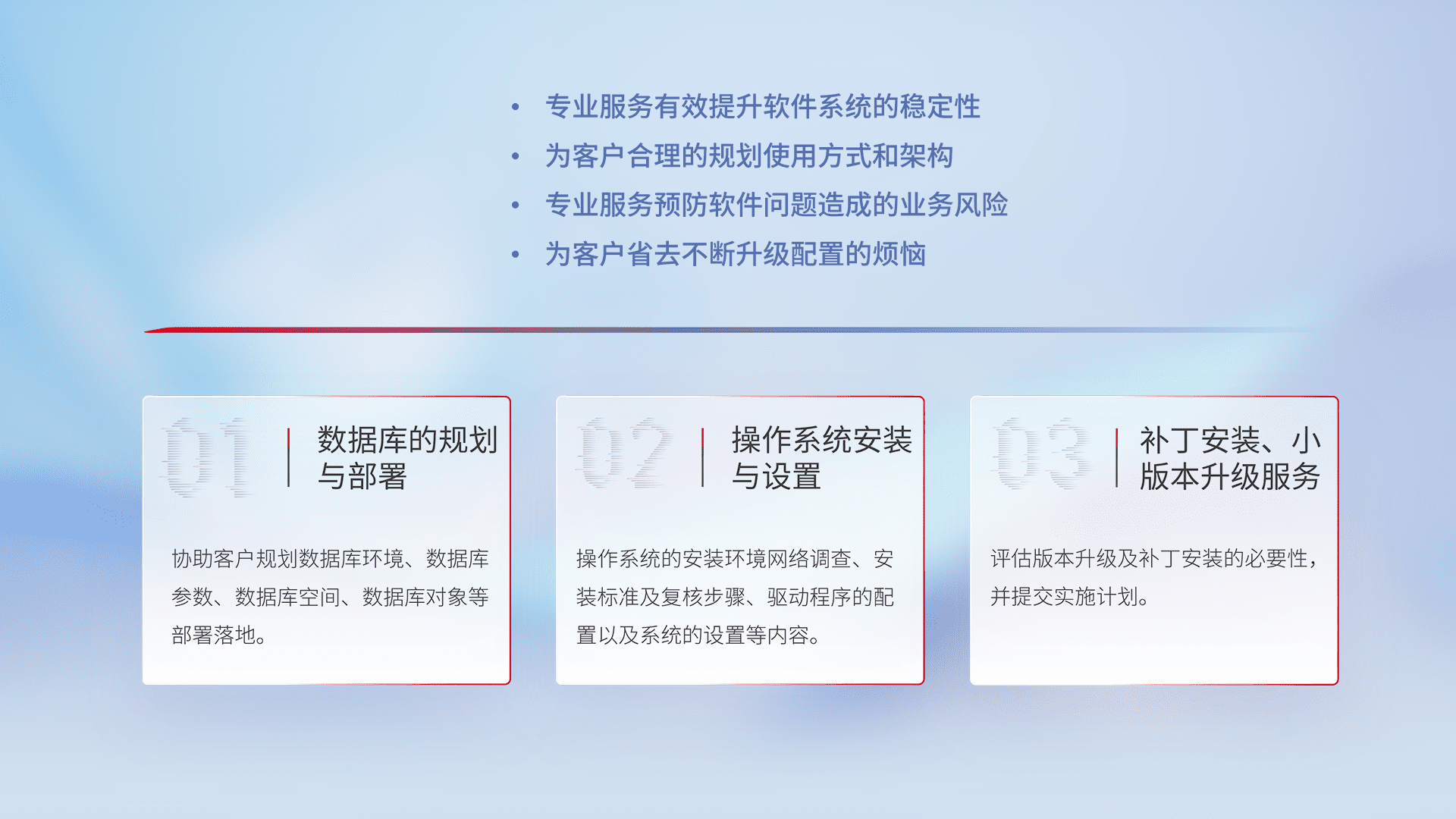 为客户提供软件规模升级、、、快速部署、、、按需配置的专业服务,,从数据库的规划与部署到操作系统的安装与设置,,,,再到补丁安装和小版本升级提供支持。。。。